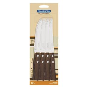Conjunto De Facas Para Churrasco E Frutas Tramontina Tradicional Com Lâminas Em Aço Inox E Cabos De Tramontina Conjunto de Facas para Churrasco e Frutas Tramontina Tradicional com Lâminas em Aço Inox e Cabos de Madeira Natural 12 Peças Tramontina - O Conjunto de Facas para Churrasco e Frutas Tramontina Tradicional com Lâminas em Aço Inox e Cabos de Madeira Natural 12 Peças é ideal para utilizar tanto no churrasco quanto para acompanhar vocês nas refeições rápidas. As facas são produzidas com lâminas em aço inox oferecendo maior durabilidade e resistência, além de possuírem cabos de madeira naturais dando aquele charme e elegância que sua mesa merece. Beleza e qualidade é com a Tramontina!OrientaçõesCom fio serrilhado, é ideal para o corte de carnes cozidas e frutas. As lâminas de aço inox tem maior durabilidade do fio devido ao tratamento térmico. Os cabos são de madeira natural. Rebites de alumínio.ObservaçõesAntes da primeira utilização, lave bem a peça e seque-a. Produto cortante e perfurante: tenha cuidado ao manusear e mantenha fora do alcance das crianças. Para maior durabilidade do produto recomenda-se secar bem antes de guardar. Recomenda-se o uso de tábuas de polipropileno ou madeira da Tramontina para maior durabilidade do fio da faca. Não é indicado o uso da faca para o corte de alimentos congelados. Para descarte dos produtos e embalagens siga as orientações de reciclagem vigentes.Características GeraisEAN137891112071773DUN1417891112071770NCM8211.91.00Peso Líquido0,3120 kg.Peso Bruto0,3400 kg.Metragem0,000835 m.Dimensões Embalagem (Compr. X Larg. X Alt.)31x 98x 275 mm. Características Gerais do Produto: Garantia: - 1 Ano