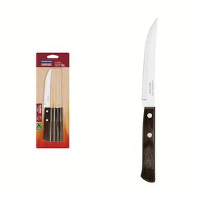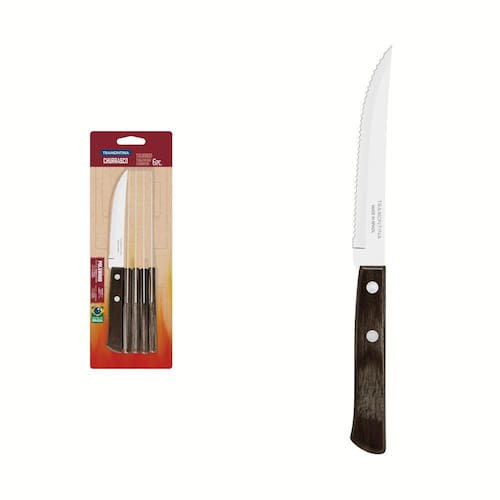Para um bom churrasco não pode faltar facas de alta qualidade. Com o Conjunto de Facas para Churrasco Tramontina 5 polegadas com Lâmina em Aço Inox com Cabo Castanho Polywood 6 Peças você poderá cortar e saborear deliciosas carnes assadas com facilidade, sem fazer muito esforço para obter o corte. As lâminas são produzidas em aço inox, oferecendo alta durabilidade e qualidade do corte. Os cabos de madeira tratada Polywood, garantem a resistência à impactos e altas temperaturas. Além disso, elas trarão para a sua mesa uma união entre o rústico e o moderno. Orientações As lâminas de aço inox têm maior durabilidade do fio devido ao tratamento térmico. Os cabos de madeira tratada Polywood são resistentes à impactos e alta temperaturas garantindo maior resistência e durabilidade. Rebites de alumínio. Podem ir à máquina de lavar louças facilitando seu dia a dia. Características Gerais EAN13 7891112189959 DUN14 17891112189956 NCM 8211.91.00 Peso Líquido 0,1848 kg. Peso Bruto 0,2200 kg. Metragem 0,000578 m³. Dimensões Embalagem (Compr. X Larg. X Alt.) 20x 105x 275 mm. Cor 1 4E3629 Hexa Observações Tenha cuidado ao manusear produtos cortantes e perfurantes e mantenha-os fora do alcance das crianças. Para maior durabilidade dos produtos recomenda-se secar bem antes de guardar, mesmo após lavagem em máquina. Para descarte dos produtos e embalagens siga as orientações de reciclagem vigentes.