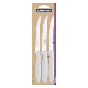 O Conjunto de Facas para Churrasco Tramontina Ipanema com Lâminas em Aço Inox e Cabos de Polipropileno Branco 3 Peças é perfeito para quem gosta de uma mesa com estilo mais clássico. As facas contam com cabo em polipropileno na cor branca combinam com qualquer decoração da sua casa e são super resistentes, pois possuem lâminas em aço inox com tratamento térmico. Elas ainda muito fáceis de limpar e podem ser lavadas na máquina de lavar louças diariamente. As refeições do seu dia a dia ficam muito mais especiais com a Tramontina! Orientações As lâminas de aço inox tem maior durabilidade do fio devido ao tratamento térmico. Os cabos de polipropileno possuem maior resistência e durabilidade. Podem ir à máquina de lavar louças facilitando seu dia a dia. Observações Tenha cuidado ao manusear produtos cortantes e perfurantes e mantenha-os fora do alcance das crianças. Para maior durabilidade dos produtos recomenda-se secar bem antes de guardar, mesmo após lavagem em máquina. Para descarte dos produtos e embalagens siga as orientações de reciclagem vigentes. Características Gerais EAN13 7891112045699 DUN14 17891112045696 NCM 8211.91.00 Peso Líquido 0,0720 kg. Peso Bruto 0,0820 kg. Metragem 0,000314 m³. Dimensões Embalagem (Compr. X Larg. X Alt.) 12x 95x 275 mm. Cor 1 FFFFFF Hexa