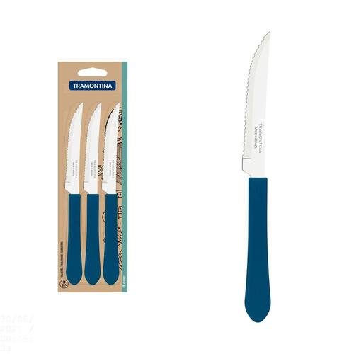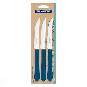 Garanta refeições mais vibrantes e alegres com o Conjunto de Facas para Churrasco Tramontina Leme com Lâminas em Aço Inox e Cabos de Polipropileno Azul Oceano 3 Peças! As peças contam com lâminas de aço inox que proporcionam resistência e durabilidade. Seus cabos são em polipropileno na linda cor azul oceano e garantem um manuseio seguro e confortável, além de deixar a composição da sua mesa muito mais estilosa. Elas ainda são muito fáceis de limpar e podem ir à máquina de lavar louças. A escolha perfeita para fazer parte do seu dia a dia! Orientações As lâminas de aço inox tem maior durabilidade do fio devido ao tratamento térmico. Os cabos de polipropileno possuem maior resistência e durabilidade. Podem ir à máquina de lavar louças facilitando seu dia a dia. Características Gerais EAN13 7891112281752 DUN14 17891112281759 NCM 8211.91.00 Peso Líquido 0,0500 kg. Peso Bruto 0,0600 kg. Metragem 0,000195 m³. Dimensões Embalagem (Compr. X Larg. X Alt.) 10x 77x 253 mm. Cor 1 005F86 Hexa Observações Antes da primeira utilização, lave bem as peças e seque-as.Tenha cuidado ao manusear produtos cortantes e perfurantes e mantenha-os fora do alcance das crianças.Para maior durabilidade dos produtos recomenda-se secar bem antes de guardar, mesmo após lavagem em máquina. Para descarte dos produtos e embalagens siga as orientações de reciclagem vigentes.
