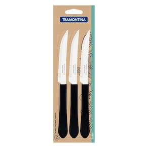 Com o Conjunto de Facas para Churrasco Tramontina Leme com Lâminas em Aço Inox e Cabos de Polipropileno Preto 3 Peças, você poderá ter peças de qualidade para saborear suas refeições. As facas são produzidas com lâminas em aço inox oferecendo maior durabilidade e ainda conta com cabos em polipropileno na cor preta proporcionando mais resistência. Os talheres são ideais para acompanhar aquelas refeições que reúnem a família. Qualidade e resistência é com a Tramontina! Orientações As lâminas de aço inox tem maior durabilidade do fio devido ao tratamento térmico. Os cabos de polipropileno possuem maior resistência e durabilidade. Podem ir à máquina de lavar louças facilitando seu dia a dia. Características Gerais EAN13 7891112173330 DUN14 17891112173337 NCM 8211.91.00 Peso Líquido 0,0500 kg. Peso Bruto 0,0600 kg. Metragem 0,000195 m³. Dimensões Embalagem (Compr. X Larg. X Alt.) 10x 77x 253 mm. Cor 1 000000 Hexa Observações Antes da primeira utilização, lave bem as peças e seque-as.Tenha cuidado ao manusear produtos cortantes e perfurantes e mantenha-os fora do alcance das crianças.Para maior durabilidade dos produtos recomenda-se secar bem antes de guardar, mesmo após lavagem em máquina. Para descarte dos produtos e embalagens siga as orientações de reciclagem vigentes.