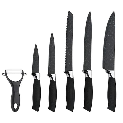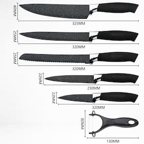 Embalagem contém 1 Faca do Chefe 18cmX3,7cm 1 Faca de Cozinha 17,5cmX2,5cm 1 Faca de Pão 17,5cmX2,5cm 1 Faca de Legumes 12cmX2cm 1 Faca de Descascar 8cmX2cm 1 Descascador 14cm Marca: Não Informado