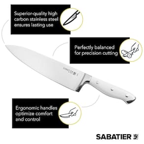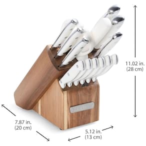 Este conjunto inclui uma faca de chef de 8 polegadas, um cortador de 8 polegadas, uma faca Santoku de 5 polegadas, uma faca de 5 polegadas serrilhada, uma faca de 5 polegadas, uma faca de aparar de 5 polegadas, 6 uma faca de bife de 5 polegadas, aço de afiar, tesouras para todos os fins, bloco de acácia Lâminas habilmente trabalhadas em aço inoxidável de alto carbono de qualidade superior Alças ergonomicamente projetadas para maior conforto durante o corte Perfeitamente ponderadas e equilibradas para controle ideal Lave à mão com água morna e detergente neutro enxague e seque imediatamente Marca: Não Informado