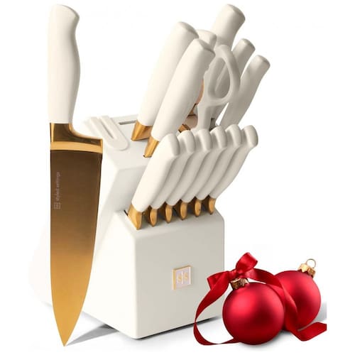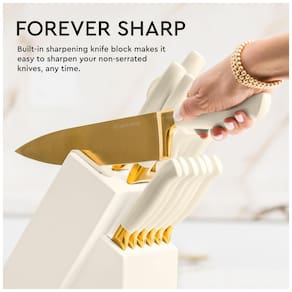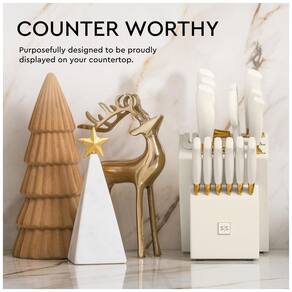 Eleve sua cozinha com este conjunto de facas douradas e brancas com bloco complemente a decoração e os acessórios dourados da cozinha com este deslumbrante conjunto de facas modernas de 14 peças com afiador O conjunto inclui: faca de chef, faca de trinchar, faca de pão, faca utilitária, faca de descascar, faca santoku, um conjunto de facas de bife brancas e douradas de 6 peças e tesouras de cozinha resistentes de aço inoxidável, tudo alojado em um conjunto de bloco de faca branco com apontador embutido POSSA AS FACAS MAIS AFIADAS DO BLOCO COM ESTE CONJUNTO DE FACAS AUTOAFIADAS nossos conjuntos de facas de cozinha com bloco autoafiado são feitos de aço inoxidável de alta qualidade que oferece grande tenacidade, resistência à corrosão e retenção de borda para excelente desempenho e afiador embutido exclusivo garante que suas facas de ouro não fiquem cegas e permaneçam afiadas para sempre recomendamos lavar e secar à mão imediatamente para manter o desempenho, aparência e brilho de seu conjunto de facas douradas e brancas para cozinha CONJUNTO DE FACA BRANCA E OURO DE QUALIDADE PREMIUM COM BLOCO TORNA O COZIMENTO MAIS FÁCIL equipe sua casa com este conjunto de faca de cabo branco coeso com um bloco de faca de madeira autoafiável para seu balcão cada faca é ergonomicamente projetada com uma alça confortável e fabricada com uma lâmina de ouro revestida de titânio para durabilidade e equilíbrio prepare carne, peixe, vegetais, frutas, pão e muito mais com facilidade com uma variedade de facas de ouro autoafiáveis para qualquer finalidade SIMPLIFIQUE SUA CASA COM UM CONJUNTO DE BLOCOS DE FACAS AFIADORES QUE GUARDAM TUDO O QUE VOCÊ PRECISA PARA FATIAR E CORTAR elimine conjuntos incompatíveis ou facas soltas e cegas que bagunçam as gavetas e aprimore sua cozinha com nosso conjunto de facas de cozinha dourado e branco que foi projetado propositadamente para complementar o ouro e o branco acessórios de cozinha e exibidos com orgulho em sua bancada conjuntos de facas brancas para cozinha com bloco fazem um presente atencioso de feriado, casamento, inauguração de casa ou formatura Marca: Não Informado