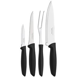 Características do produto:<br/>Cor:Cabo Preto<br/>Modelo: Plenus<br/>Marca: Tramontina<br/>Fabricante: Tramontina<br/>Sessão: Facas<br/>Quantidade de Peças: 4 peças<br/>As lâminas de aço inox tem maior durabilidade do fio devido ao tratamento térmico. <br/>Os cabos de polipropileno possuem maior resistência e durabilidade. <br/>Podem ir à máquina de lavar louças facilitando seu dia a dia.<br/><br/>Dicas para Utilização:<br/>Antes da primeira utilização, lave bem as peças e seque-as. <br/>Tenha cuidado ao manusear produtos cortantes e perfurantes e mantenha-os fora do alcance de crianças. <br/>Para maior durabilidade dos produtos, recomenda-se secar bem antes de guardar, mesmo após lavagem em máquina.<br/>Para descarte dos produtos e embalagens siga as orientações de reciclagem vigentes.<br/><br/>Conteúdo do Jogo:<br/>1 Faca Chef 7" Plenus<br/>1 Faca para Desossar 5" Plenus<br/>1 Faca para Legumes e Frutas 3" Plenus<br/>1 Garfo Trinchante Plenus<br/><br/>Dimensões:<br/>Dimensões Embalagem (Compr. X Larg. X Alt.): 2,x 16,3 x ,84 cm<br/><br/>Peso:<br/>Peso Líquido: 0,2100 kg.<br/>Peso Bruto: 0,2500 kg.<br/><br/>Garantia: 3 Meses ( ofertada pelo fabricante)<br/><br/><br/>Fornecedor: Tramontina<br/>;