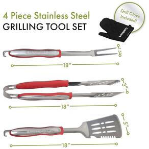 FERRAMENTAS PARA GRELHADORES ESSENCIAIS Conjunto de ferramentas inclui espátula para grelhar, garfo para grelhar, pinças para grelhar e uma luva para grelhar resistente ao calor adicional CONSTRUÇÃO DURÁVEL Feito de aço inoxidável durável com alças de borracha resistentes ao calor PEGA CONFORTÁVEL Pegas de plástico emborrachado garantem conforto e uma pegada segura LONGO ALCANCE Alças alongadas mantêm as mãos seguramente longe do calor DISPONÍVEL EM 5 CORES O conjunto está disponível em vermelho, preto, azul, laranja e verde Marca: Não Informado