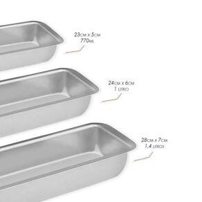 Dimensões:Forma Grande: Comprimento 30,5cm x Largura 13,5cm x Profundidade 5,6cmForma Média: Comprimento 27,5cm x Largura 12,5cm x Profundidade 5cmForma Pequena: Comprimento 24cm x Largura 11cm x Profundidade 4,5cmCapacidade:Forma Grande: 1,4 litroForma Média: 1 litroForma Pequena: 770 mlPeso:Forma Grande: Aprox. 150gForma Média: Aprox. 115gForma Pequena: Aprox. 100gConteúdo: