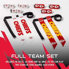 - Conjunto de futebol KANSAS CITY CHIEFS FLAG: Projetado com logotipos e cores oficiais da equipe, este conjunto inclui (8) cintos, (4) em casa e (4) fora, para que você possa jogar dois times de quatro um contra o outro