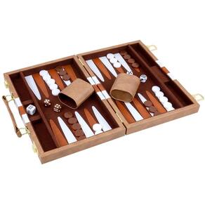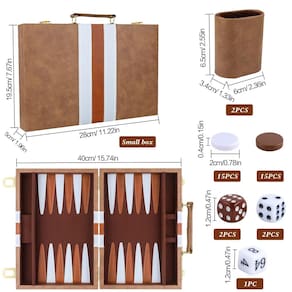 RERIVER Conjunto de 2 jogadores de gamão clássico para adultos, jogo de tabuleiro com estojo de couro premium portátil e conjunto de gamão de viagem (marrom retrô, 28 cm) - Conjunto de gamão pequeno de 28 cm em uma pasta de couro sintético marrom retrô com duas travas de metal dourado e alça de couro sintético confortável para facilitar o transporte. - O campo de jogo é um tecido aveludado macio com pontos de couro sintético costurados na superfície e copos de dados de couro sintético com forro de feltro marrom para manter o ruído de rolamento dos dados ao mínimo. - Conjunto clássico de gamão que contém tudo o que você precisa para um jogo desafiador de gamão, perfeito para viagens, ambientes internos, ao ar livre e diversão em família. - Tamanho: Capa de couro sintético de 28 cm, tamanho fechado 28 x 19 x 5 cm, tamanho aberto: 35,5 x 28 x 2,5 cm, fácil de transportar e armazenar. - O conjunto de gamão de couro sintético inclui: 1 x tabuleiro de gamão + 30 fichas de gamão (15 de cada cor) + 4 x dados regulares + 1 x dados duplos + 2 x copos de dados.