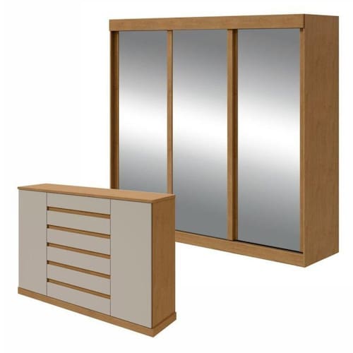 1x Guarda-roupa 3 Portas 3 Gavetas Saion Plus Super Glass Amêndoa Clean/Off White/Amêndoa Clean Altura: 218 cm Necessita Montagem: Sim