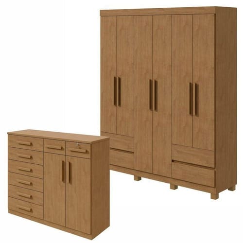 O conjunto inclui um guarda-roupa Zeus com 6 portas 4 gavetas e espelho, além de uma cômoda Toronto com 8 gavetas e 2 portas. Esses móveis oferecem solução completa para organização, combinando funcionalidade e design contemporâneo.