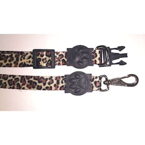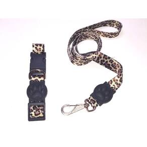 Conjunto de guia e coleiras confeccionadas em fita 25 mm de seda preta com estampa de onça;