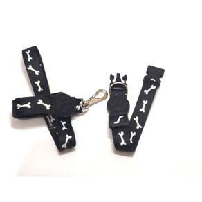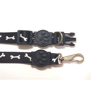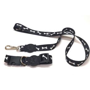 Conjunto de guia e coleiras confeccionadas em fita 25 mm de seda preta com estampa de ossinho branco; Presilha de plástico altamente resistentes com passadores de ajuste e borracha em formato de pata; cor: preto Tamanho único. Especificações Guia: 90 cm Coleira: 32 a 49 cm. O seu pet vai ficar todo estiloso e alegre com a coleira de seda. Marca: Não Informado Ean: 7439217785869
