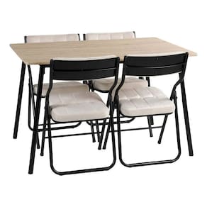 As cadeiras, com assento e encosto revestidos em tecido bege, oferecem conforto e aconchego, enquanto a estrutura em preto adiciona um toque de robustez e sofisticacao. A mesa, tambem com estrutura preta, apresenta um tampo que complementa o visual das cadeiras, criando um conjunto coeso e atraente. A montagem e simples e intuitiva, permitindo que voce desfrute rapidamente de um ambiente renovado.