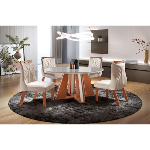 O Conjunto de Jantar Aurora é a perfeita fusão entre elegância contemporânea e conforto sofisticado. A mesa redonda, com tampo em vidro de acabamento refinado, destaca-se pelo design geométrico da base em madeira, criando um jogo de formas que adiciona personalidade ao ambiente. As cadeiras, com estofamento em tecido bege de toque suave e detalhes em madeira que harmonizam com a mesa, apresentam um encosto com costura em relevo, remetendo a delicadas folhas, proporcionando um visual orgânico e acolhedor. Ideal para salas de jantar que buscam um toque moderno sem abrir mão da sofisticação.