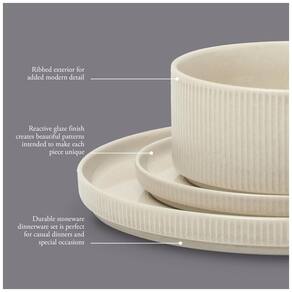 Imagine uma cidade costeira pitoresca, com seu estilo de vida tranquilo e um sol radiante, como fonte de inspiração para design e inovação. A Coleção de Jantar Solana Coast Reactive captura o charme intocado de uma cidade à beira-mar e o traduz em elegante louça, perfeita tanto para refeições internas quanto externas. O acabamento de alto brilho reflete o sol nas águas calmas, adicionando um brilho radiante a cada peça. Feita de argilas terrosas, esta coleção se transforma em deslumbrante cerâmica que complementa qualquer mesa, realçando a vivacidade de cada prato. Sua fabricação requer um processo complexo, no qual as peças são queimadas várias vezes em altas temperaturas para criar uma construção perfeitamente resistente ao desgaste e não porosa. Uma camada de esmalte reativo finaliza o processo, permitindo que cada prato e tigela ganhem vida com sutis variações naturais, garantindo que nenhuma peça seja igual à outra. Projetada com laterais altas e retas para empilhamento fácil e nervuras exteriores para adicionar profundidade e textura, esta coleção alcança o equilíbrio perfeito entre elegância clássica e estilo contemporâneo. Este conjunto de jantar, como um conjunto de peças essenciais para o lar, é um presente de bom gosto para qualquer ocasião. Amado por sua utilidade prática e apelo decorativo, ele expressa seu gosto impecável e bons desejos para familiares, amigos, novos proprietários e recém-casados. Lavável em lava-louças e micro-ondas. Genuine sophisticated and thoughtfully versatile, Gibson Elite oferece uma mistura elegante de forma e função para uma infinidade de louças, utensílios de servir e acessórios de mesa. Qualidade na seleção de materiais e estética elegante em designs e técnicas de esmaltação proporcionam infinitas possibilidades para arranjos de mesa criativos e ocasiões de jantar.