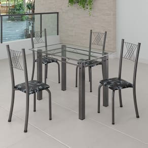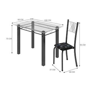 Quer deixar sua casa completa? Uma dica bacana de como transformar o seu lar, deixando-o mais receptivo e bonito? Então você precisa de móveis indispensáveis e deixar seu lar muito mais aconchegante, receptivo e sempre disponível para receber a visita de amigos, familiares e convidados. Você vai se apaixonar por este incrível Conjunto de Mesa com 4 Cadeiras Dany. Ideal para cozinha, ele é a melhor opção para completar o espaço. Aproveite!! Medida da Mesa (A x L x P): 75 cm x 60 cm x 100 cm Peso da Mesa: 37,6 kg Mesa suporta até: 8.0000 Acabamento da Cadeira/Banco: Pintura Texturizada Acabamento da Mesa: Pintura Texturizada Ambiente Principal: Cozinha Cadeira/Banco estofada: Somente Assento Estofado Cadeira/Banco suporta até: 120.0000 codigo_ean: 7909903360309 Complexidade da Montagem: Média: pode ser montado por mais de uma pessoa e/ou necessite de maior conhecimento para montagem Cor: Preto Floral/Mart Prata Cor do Produto: Preto Floral/Mart Prata Escala de Brilho: Semi-Brilho Espessura do Tampo: 6 mm Itens Inclusos: 1 Mesa, 4 Cadeiras, Kit Ferragens e Manual de Montagem Linha ou Coleção: Sara Manual de Especificação Técnica: https://product-hub-prd.madeiramadeira.com.br/860582/documents/f30c8759-1cf3-48d1-8e45-12f6ee3cdc31parasaladejantarv02yescasa.pdf Manual de Montagem e Instalação: https://product-hub-prd.madeiramadeira.com.br/860582/documents/bbac194e-b663-453c-9473-a96b890716c0olorsaladejantarv02yescasa.pdf Manutenção: Pano levemente umedecido e pano seco. Não utilizar produtos de limpeza abrasivos. Material da Base da Mesa: Aço Material da Estrutura da Cadeira: Aço Material do Tampo: Vidro Medida da Base (A x L x P): 74,3 cm x 73 cm x 54 cm Medida da Cadeira/Banco (A x L x P): 95 cm x 40 cm x 37 cm Medida do Tampo (L x C x E): 60 cm x 100 cm x 0,6 cm Necessita Montagem: Sim Origem do Produto: Nacional Peso da Cadeira/Banco: 2,94 kg Possui Apoio Para os Pés: Não Quantidade de Cadeiras: 4 Quantidade de Lugares: 04 Recomendações de Uso, Manutenção e Limpeza: Pano levemente umedecido e pano seco. Não utilizar produtos de limpeza abrasivos. Sistema de Montagem: Parafusos Vidro Temperado: Sim