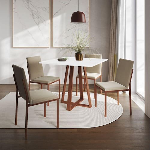 Conjunto De Jantar Mesa Mônaco 90cm Tampo Branco Com 4 Cadeiras Bege Base Cobre - Cor: Preto