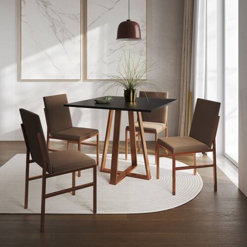 Com um design sofisticado e contemporâneo, este conjunto é perfeito para transformar suas refeições em momentos especiais. A mesa espaçosa oferece espaço suficiente para acomodar sua família e convidados, enquanto as cadeiras estofadas proporcionam conforto excepcional durante as refeições. Seja para jantares formais ou encontros casuais, nosso conjunto de mesa e cadeiras é a escolha perfeita para adicionar estilo e funcionalidade à sua sala de jantar.Tipo: ConjuntoModelo: MônacoTecido Cadeira: VeludoCor Estofado: Marrom Cor Base Cadeira: CobreCor Tampo Mesa: Preto Cor Base Mesa: Cobre Medidas Cadeira:Altura: 85cmLargura: 41cmComprimento: 50cmMedidas Mesa:Altura: 76cmLargura: 90cmComprimento: 90cmATENÇÃOIMAGENS MERAMENTE ILUSTRATIVAS REALIZADO EDIÇÃO, PODENDO HAVER UMA PEQUENA VARIAÇÃO DE COR DEPENDENDO DE CADA TELA OU MONITOR.