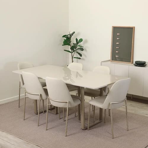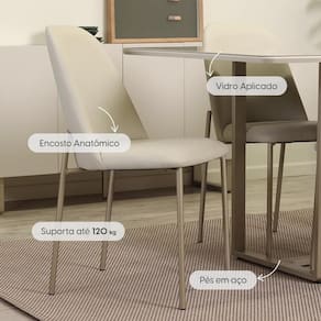 Mesa de Jantar Retangular com Vidro para 6 Lugares Arcádia 160 cm - Champanhe c/ Off White FoscoProduzido com pés em chapa de aço com acabamento em pintura eletrostática.