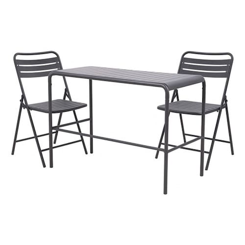 Resumo das caracteristicas e especificacoes: Conjunto de moveis para jardim, tipo de conjunto: mesa e cadeira, material: aco, cor: cinza, para 2 pessoas, uso indicado: para estar, areas indicadas: externas e externas com cobertura, estilo: contemporaneo, quantidade de pecas: 3, mesa com tampo de metal, formato da mesa: retangular, dimensao da mesa: 75x45x120, cadeiras dobraveis, dimensao da cadeira: 85x49x55, montagem simples, garantia do fabricante: 12 anos."