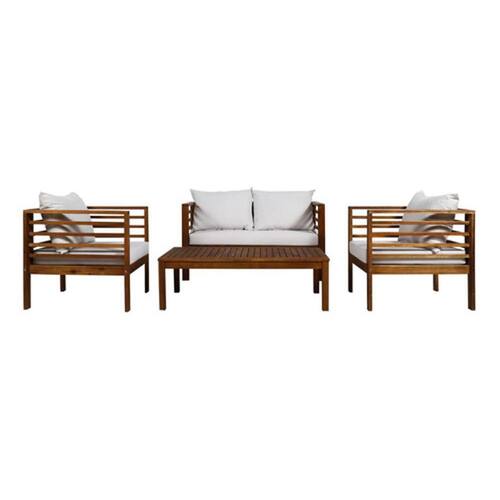 Aprimore o seu espaco externo com o Conjunto de Area Externa 4 Pecas Ravenna feito em madeira da Just Home Collection. Com capacidade para 4 pessoas, este conjunto inclui 1 mesa e 4 confortaveis poltronas com almofadas. A estrutura de madeira garante durabilidade e resistencia, enquanto a superficie em poliester proporciona conforto durante o uso. Com acabamento natural e cor marrom, este conjunto adiciona elegancia ao seu jardim, varanda ou area de lazer. A mesa possui um diametro de 60 cm, sendo um espaco ideal para momentos de lazer ao ar livre. Nao dobravel, este conjunto possui uma embalagem com comprimento de 136 cm e pesa 60 kg bruto e 30,220 kg liquido. Marca: Não Informado
