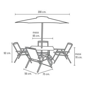 O conjunto e composto por quatro cadeiras, uma mesa de vidro retangular e um ombrelone, todos projetados para resistir ao uso diario. As cadeiras e o ombrelone sao feitos de TEXTILENO, um material resistente que suporta ate 100 kg, enquanto a mesa possui um tampo de vidro duravel e uma estrutura de aco. O design compacto e leve do conjunto facilita a movimentacao e o reajuste conforme necessario, tornando-o ideal para espacos pequenos e grandes.