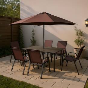 Transforme seu espaco ao ar livre em um verdadeiro oasis de conforto e estilo com o Conjunto de Moveis para Jardim Capitolio. Este conjunto, composto por 9 pecas, oferece tudo o que voce precisa para criar uma area de estar elegante e funcional. Composto por uma mesa retangular, seis cadeiras e um ombrelone, e a escolha perfeita para receber amigos e familiares em momentos de descontracao ao ar livre. Fabricado em aco de alta qualidade, o conjunto e resistente e duravel, ideal para areas externas. A mesa, com dimensoes de 150x90x71cm, possui um tampo de metal robusto e um furo central para acomodar o ombrelone, garantindo sombra e frescor durante os dias ensolarados. As cadeiras, com estrutura tambem em aco e assentos em tecido textilene, medem 92x73x55cm, proporcionando conforto e suporte adequados para longas horas de uso. O ombrelone, com uma cobertura em tecido e estrutura metalica, mede 200x200x220cm e inclui uma base para facilitar sua fixacao, oferecendo protecao contra o sol e criando um ambiente agradavel. Este conjunto e projetado para areas externas, com um estilo atemporal que combina com qualquer decoracao de jardim. Embora o produto nao seja indicado para regioes com maresia ou contato direto com agua, sua montagem e simples e pode ser realizada por uma pessoa leiga, gracas ao manual de instrucoes incluso. Alem disso, o conjunto oferece uma garantia de 03 meses contra eventuais defeitos de fabricacao. Se busca um mobiliario que alie funcionalidade e design sofisticado, o Conjunto de Moveis para Jardim Capitolio e a escolha ideal para transformar sua area externa em um espaco de convivencia elegante e acolhedor. Produto: Conjunto de Moveis para Jardim Tipo de Conjunto: Mesa, Cadeira e Ombrelone Colecao Jardim: Capitolio Marca: Importado Tipo de Material: Aco Cor: Marrom Tonalidade: Marrom Quantidade de Lugares: 6 lugar(es) Uso Indicado do Movel: Para Estar Areas Indicadas: Externas Estilo: Atemporal Quantidade de Pecas: 9 peca(s) Acompanha Mesa: com Mesa Material do Tampo da Mesa: Metal Tipo de Material do Tampo da Mesa: Aco Material da Estrutura da Mesa: Metal Tipo de Material da Estrutura da Mesa: Aco Cor da Mesa: Marrom Tonalidade da Mesa: Marrom Mesa Dobravel: Nao Furo para Ombrelone: Sim Dimensao da Mesa (AxLxC): 150x90x71cm Formato da Mesa: Retangular Acompanha Banqueta: sem Banqueta Acompanha Cadeira: com Cadeira Material do Assento da Cadeira: Tecido Tipo de Material do Assento da Cadeira: Textilene Material da Estrutura da Cadeira: Metal Tipo de Material da Estrutura da Cadeira: Aco Material da Encosto da Cadeira: Tecido Tipo de Material da Encosto da Cadeira: Textilene Cadeira Dobravel: Nao Dimensao da Cadeira (AxLxP): 92x73x55cm Acompanha Sofa: sem Sofa Acompanha Ombrelone: com Ombrelone Material da Cob Marca: Não Informado Ean: 3267078965786