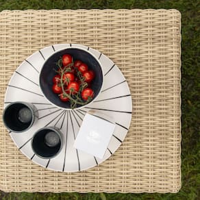 "Transforme seu espaco externo em um verdadeiro oasis de conforto e estilo com o Conjunto de Moveis para Jardim Medena da Naterial. Este conjunto sofisticado, composto por 5 pecas, oferece um equilibrio perfeito entre design moderno e funcionalidade. Composto por um sofa espacoso e uma mesa retangular com tampo de vidro temperado, ele e ideal para refeicoes ao ar livre, proporcionando um ambiente acolhedor e elegante para ate 7 pessoas.