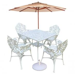 Descubra a combinação perfeita de estilo e funcionalidade com o Conjunto de Jardim com Mesa Quadrada, 4 Cadeiras de Alumínio Fundido e Guarda-Sol de 3,00m. Este conjunto é ideal para criar um ambiente acolhedor e sofisticado, perfeito para refeições em família, encontros com amigos ou momentos de relaxamento.
