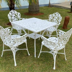 Mesa Quadrada Elegante: Com um design moderno e prático, a mesa quadrada é feita de alumínio fundido, garantindo resistência e durabilidade. Seu formato proporciona um espaço ideal para compartilhar deliciosas refeições e bons momentos, permitindo que todos fiquem próximos.