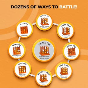 Escolha a sua cor, escolha a sua batalha e salte para ganhar! Coloque o cubo de jogo diretamente em uma mesa ou chão sólido. Posicione-se muito perto do cubo no lado oposto do seu oponente (saltos mais próximos são mais fáceis). Jogue multijogador, individualmente, times ou torneio. Seja criativo e divirta-se. Jogadores: Mais de 2 jogadores (2 jogadores/equipes, exceto onde indicado). Dezenas de maneiras de lutar! BATALHAS 3D Tic-Tac-Toe Battle: Seja o primeiro a quicar três conjuntos de três bolas em uma fileira em qualquer direção. Bird's Eye Tic-Tac-Toe Battle: Seja o primeiro a obter três bolas em uma fileira como visto de cima do cubo; apenas as bolas superiores em qualquer espaço contam. Lucky 13 Battle: Seja o primeiro a lançar 13 bolas em qualquer local do cubo. Great Wall Battle: Seja o primeiro a lançar nove bolas na parede mais próxima de você. Point Ball Battle: Seja o primeiro a marcar 21 pontos. Três bolas por rodada. War Chest Battle: salte todas as 27 bolas no cubo no mínimo de tentativas ou tempo. Batalha de sopa do alfabeto: Seja o primeiro a quicar bolas na forma de uma letra ou forma escolhida em qualquer nível horizontal, vertical ou diagonal. Batalha de nove copos: Seja o primeiro a pousar em cada um dos nove espaços (ou "xícaras"). Duas bolas por rodada. Remova as bolas duplicadas dos copos. Nivelar batalha: salte mais bolas em quaisquer dois níveis horizontais (cinco bolas ganham o nível inferior e médio). Batalha H-O-R-S-E (Trick Shot): Seja o único jogador a não soletrar "Cavalo". Os jogadores recebem uma carta quando não conseguem corresponder à tacada autêntico. Coloque o cubo em qualquer lugar e salte de qualquer local. Inclui: um cubo de jogo, 27 bolas brancas e laranja de alta qualidade (uma extra) e instruções. - Bounce Battle Confronto: Envolva-se em batalhas emocionantes com a família e amigos enquanto você caminha para a vitória com nosso envolvente jogo familiar interno. Jogo do ano da Creative Child Magazine – o conjunto Bounce Battle Game é uma explosão absoluta! - Guia de jogo rápido: escolha sua cor, escolha sua batalha e salte para vencer com este jogo cheio de diversão para a família! Prepare-se para esses jogos de estratégia intensos para dois ou mais colocando o cubo em uma mesa, posicionando-se de perto para aquelas tacadas estratégicas e preparando-se para saltar! - Presente divertido para todas as idades: este conjunto de jogos legais para adolescentes inclui um cubo de jogo, 27 bolas brancas e laranja de alta qualidade e instruções fáceis de seguir. De noites de jogos em família a reuniões animadas de amigos, este presente para adolescentes pode ser jogado individualmente, em times ou em estilo de torneio. - Jogabilidade ativa: nossos jogos de festa infantil combinam estratégia, habilidade e chance para diversão competitiva, seja correndo até o final ou se revezando. Com rodadas de apenas 1 a 5 minutos, este presente exclusivo para adolescentes oferece uma emoção rápida para reuniões improvisadas ou pausas rápidas. - Vários estilos de batalha: com dezenas de batalhas em um salto de jogo, os desafios incluem 3D Tic-Tac-Toe, Nine Cup, Level Out, Point Ball, H-O-R-S-E (tacada de truque) e muito mais. A jogabilidade dinâmica torna este jogo o presente perfeito para adolescentes. Não perca nosso baralho complementar de cartas Bounce Battle (vendido separadamente) para desbloquear centenas de novas maneiras de jogar! - Melhore sua experiência com as cartas de batalha, nosso baralho adicional de cartas para criar centenas de maneiras de jogar! Premiado como jogo do ano pela Creative Child Magazine