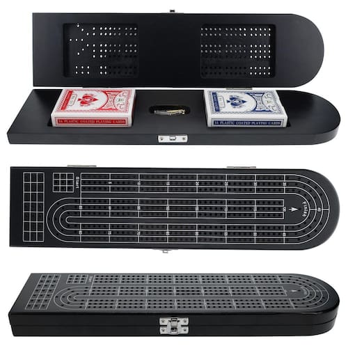 Esta linda tábua de armário de três faixas é feita de madeira maciça manchada de preto com um acabamento acetinado aplicado. A linda placa de madeira de duas peças tem uma dobradiça estilo piano para resistência e um fecho de trava de latão para manter os 9 pinos de metal fáceis de segurar e o baralho de cartas armazenados perfeitamente dentro. O feltro de veludo reveste os compartimentos de armazenamento dentro do quadro. A superfície de pontuação contínua de três faixas tem uma linha skunk de 90 pontos e notações numéricas impressas em preto. Os furos de pino são perfurados com precisão. Inclui área inicial de 3 pinos, tabuleiro de tamanho normal de 120 unidades, linhas de gambá, um orifício de acabamento peg out e rastreamento de vitórias do jogo. Os pinos de metal apresentam topos de fácil aderência para uma experiência de jogo de maior qualidade. É o presente perfeito para o Dia dos Pais, formatura, inauguração de casa ou para os recém-casados que amam o jogo de berço. Este presente será apreciado por gerações. - Placas de berço exclusivas: cuidadosamente trabalhadas com peças sólidas de madeira e conectadas com uma dobradiça estilo piano para maior resistência. Um fecho cromado mantém a prancha fechada e permite viagens. - Placa contínua de 3 trilhas: possui furos perfurados com precisão e pontuação impressa em tela prateada. Inclui área de partida de 3 pinos, tabuleiro de jogo de tamanho normal de 120 unidades, linhas de skunk e um orifício de acabamento de fixação. - Armazenamento de jogos de tabuleiro: nosso tabuleiro de cribbage mede 37,5 x 9,5 x 3,1 cm. Ranhuras de armazenamento dentro do tabuleiro armazenam 2 baralhos de cartas e 9 pinos de metal para berço (3 cromados, 3 de latão, 3 pretos). Instruções incluídas. - Divertido para todos: este conjunto de jogo de tabuleiro de cribbage é utilizado para pontuação ao fixar a pontuação ao longo da pista de tabuleiro de cribbage. Este tabuleiro de jogo também é utilizado para marcar o jogo de dominó. 2 a 3 jogadores - PACIFIC SHORE GAMES: Fazendo belos jogos de qualidade de relíquia de família, um jogo de cada vez.
