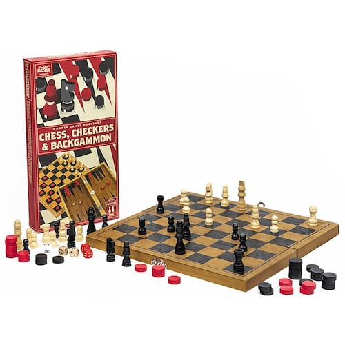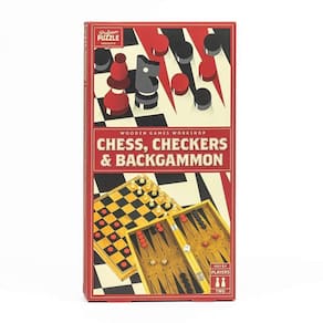 Professor Puzzles Classic Wooden Chess, Checkers & Gamão - Conjunto de jogos de tabuleiro de madeira para 2 jogadores. Vá para a batalha com um amigo ou membro da família em qualquer um dos três jogos de tabuleiro clássicos, o conjunto de jogos de pub perfeito, conjunto de jogos de acampamento ou adição à noite de jogos em família. O jogo de tabuleiro de madeira inclui tabuleiro de jogos de madeira reversível, peças de xadrez, damas, dados e instruções. Parte do conjunto Professor Puzzles Wooden Games Workshop de jogos clássicos de madeira artesanais.
