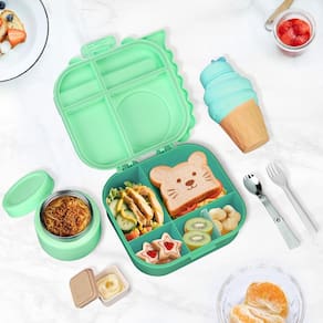 - Banqueteie-se como um herbívoro faminto com compartimentos 4+1 e Treasure Thermo! Organize magistralmente refeições épicas nesta lancheira de dinossauro: 'rochas' vegetarianas, 'presa', sanduíche 'pedregulho' e mergulhe 'lava'! A garrafa térmica de 340 g mantém as sopas quentes ou iogurte gelado para 6-80 Horas.Inclui um Copo de molho à prova de vazamento – ideal para crianças** explorando sabores!"