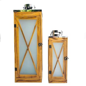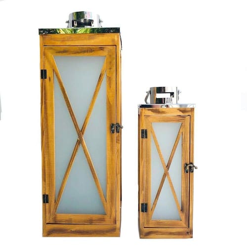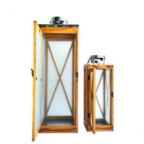 Conjunto de Lanternas Preparaçãos Madeira Vidro Fosco Descrição: Lanterna estilo Preparação, ótimo pra dar um toque de elegância e iluminação aconchegante a qualquer ambiente. Possui alça, tem design atraente e muito sofisticada. Características: Lanterna Grande: Altura C/ Alça: 73,5cm Altura S/ Alça: 61,5cm Largura: 21cm Adaptávelimento: 21cm Peso: 3462Kg Lanterna Pequena: Altura C/ Alça: 49,5cm Altura S/ Alça: 40,5cm Largura: 14cm Adaptávelimento: 14cm Peso: 1,526Kg Adaptávelsição: Madeira, Metal e Vidro Conteúdo: - 1 x Unidade de Lanterna Madeira Grande - 1 x Unidade de Lanterna Madeira Pequena Cod: HL1113 ; Sku: 1EFLM063