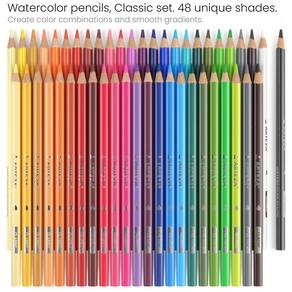 Conjunto de lápis de aquarela de alta qualidade com 49 unidades altamente pigmentadas, solúveis em água, para misturar, mesclar e sobrepor suavemente, garantindo resultados profissionais. Basta adicionar água para transformar suas cores em aquarelas. Realce desenhos ou use em seu livro de colorir favorito. Este conjunto único de lápis possui design triangular, proporcionando conforto ao segurar e fácil controle. Com minas macias e densas, cada lápis colorido é resistente a quebras e envolto em madeira de bétula de alta qualidade e ultraleve. Desenvolvido por artistas para artistas, os produtos Arteza buscam inspirar a expressão artística como parte da experiência humana. A Arteza foi criada com o objetivo de oferecer materiais artísticos de qualidade para todas as idades e níveis. Encontre uma variedade de acessórios de artes e artesanato, conjuntos de pintura, materiais de desenho e muito mais para suas necessidades artísticas.