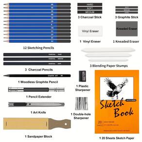 Material: madeira Tamanho: 18 cm × 10 cm × 3 cm Peso: 300 g Kit de desenho completo: este conjunto de 33 peças inclui lápis de grafite que variam de 4H a 8B, lápis de carvão, tocos de mistura, borrachas amassadas e de vinil, apontador e um caderno de desenho de alta qualidade para todas as suas necessidades criativas. Lápis de alta qualidade: nossos lápis de desenho são feitos para linhas suaves e consistentes, com uma ampla gama de durezas para se adequar a todos os estilos de desenho, seja para esboçar, sombrear ou detalhar. Perfeito para todos os níveis de habilidade: este conjunto foi projetado para iniciantes e artistas profissionais. Se você está apenas começando ou é um desenhista experiente, este conjunto tem tudo o que você precisa para desenhos detalhados e precisos. Suprimentos de desenho versáteis: inclui ferramentas de mistura, borrachas e um extensor de lápis para ajudar a criar vários efeitos e texturas, tornando-o uma escolha essencial para técnicas de desenho, sombreamento e esboço. Portátil e conveniente: o conjunto vem em um estojo prático e portátil com zíper, permitindo que você armazene e carregue facilmente seus suprimentos para desenhar em casa, no estúdio ou em qualquer lugar.