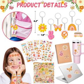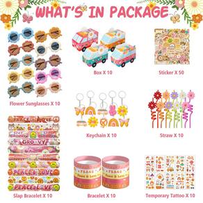 - Lembranças de festa descoladas: 120 peças, incluindo caixas de ônibus, óculos de sol de flores retrô, tatuagens temporárias, pulseiras, chaveiros, canudos de plástico e pulseiras de silicone.