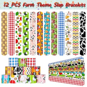 - O pacote inclui — O conjunto de lembrancinhas de festa para animais de fazenda inclui 12 peças de máscaras de animais de fazenda, 12 peças de chaveiros, 12 peças de adesivos, 12 peças de palha, 12 peças de pulseiras Slap, 12 peças de porcos de borracha rosa, 12 peças de sacolas de presente de papel.