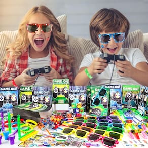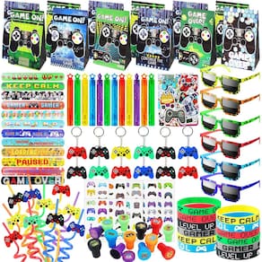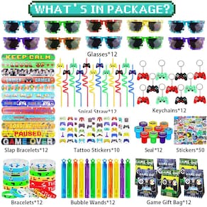 - Conjunto de videogame econômico: conjunto de lembrancinhas de festa de videogame de 156 peças. Inclui 12 sacos de presente de jogos, 12 óculos pixelados, 12 canudos espirais, 12 varinhas de bolha, 12 pulseiras de silicone para jogadores, 12 chaveiros, 12 pulseiras, 12 carimbos, 10 adesivos de tatuagem de jogos e 50 adesivos de vinil para jogos. Estas lembrancinhas de festa são perfeitas para mergulhar os jogadores e adicionar diversão. Seja como lembrancinhas de festa de aniversário ou videogame para presentes, é essencial para festas de videogame.