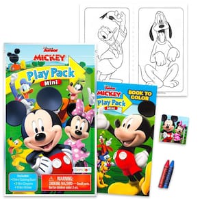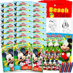 - Disney O conjunto de artigos de festa do Mickey Mouse possui 24 mini pacotes Grab n Go Play, cada um inclui um livro de colorir em miniatura, adesivos e utensílios de colorir.