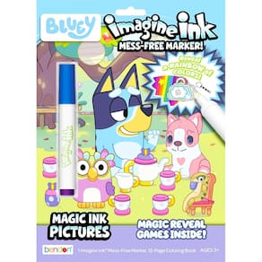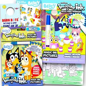- Cada Imagine Ink inclui uma caneta mágica que revela imagens ocultas e não marca visivelmente outras superfícies. Cada livro sem bagunça apresenta personagens incluindo Bluey, Bingo, Bandit, Chilli e muito mais.