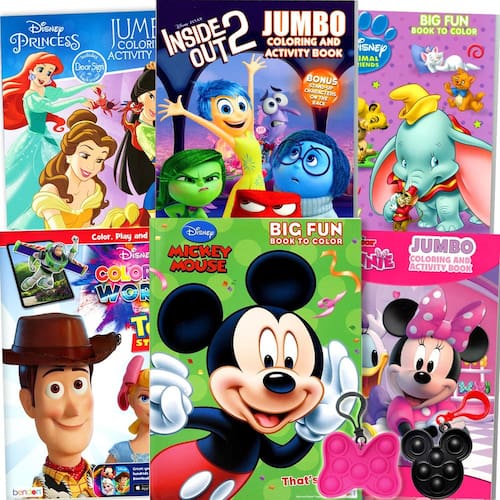 Este conjunto de livros de colorir clássicos da Disney para meninos e meninas inclui 6 livros de colorir variados, desde a produção clássica da Disney até a criação moderna. Este conjunto de livros inclui dois brinquedos fidget pop oficialmente licenciados do Mickey e da Minnie. - Este conjunto de livros de colorir clássicos da Disney para meninos e meninas inclui 6 livros de colorir variados, desde a produção clássica da Disney até a criação moderna. Este conjunto de livros inclui dois brinquedos fidget pop oficialmente licenciados do Mickey e da Minnie. - Livros com personagens da Disney, incluindo Mickey Mouse, Minnie, Disney Princess, Inside Out, Toy Story e Disney Dumbo. - 6 livros de colorir: tamanho completo, a capa pode variar, mais de 450 páginas no total e cada uma mede cerca de 21,5 x 28 cm - Chaveiro Mickey e Minnie Pop Fidget brinquedos. Dois bonecos Pop Fidget. Oficialmente licenciada. Ótimo complemento para meninos e meninas. - Diversão sensorial que mantém os pequenos ocupados estourando e aprendendo habilidades motoras finas. Sem ruído e macio, reutilizável e lavável - Livros de colorir e atividades infantis oficialmente licenciados pela Disney. Oferece muitas horas de diversão. Ideal para crianças a partir de 3 anos de idade