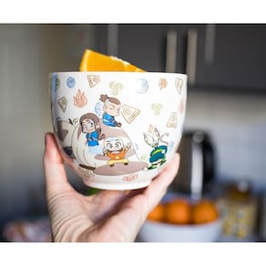 - Design Chibi: esta tigela de ramen branco apresenta personagens coloridos no estilo chibi da popular série Nickelodeon. O design divertido inclui Aang, Katara, Sokka, Toph, App e Momo. Os símbolos das quatro tribos também estão representados.