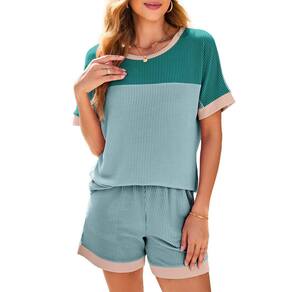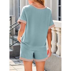 - Características: Roupas femininas Dokotoo de 2 peças, conjuntos combinando com lounge, tops e shorts de manga curta com gola redonda e cor block.