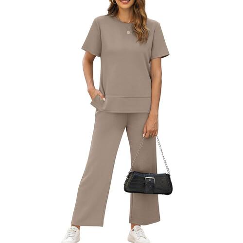 XIEERDUO Conjunto feminino de 2 peças, moda para viagem, fato de treino, confortável, pernas largas, para aeroporto, P-3GG, Cáqui escuro - Tecido leve como o ar/fluxo de ar ideal/elasticidade em 4 direções. As 2 peças são feitas com tecido espaçador leve, macio e ultra drapeado, projetado para parecer sedoso em sua pele. - Gola redonda básica/manga curta/blusa com fenda lateral. Esta túnica confortável é longa o suficiente para cobrir seus quadris, esconder sua barriga - Comprimento curto (9/10)/ Calça com cordão de cintura elástica/calça de moletom de perna larga. Calça com dois bolsos laterais práticos, ajuda a segurar seu celular, chaves, moedas e batons facilmente, pare de se preocupar com onde colocar seu telefone enquanto você está trabalhando/praticando esportes - Pode ser vestido por cima ou por baixo, ótimo para uso casual/vestir-se/férias/viagens/negócios casuais/trabalho/exercícios - Lavar à máquina em água fria, secar em temperatura baixa ou pendurar para secar. Passar a ferro em configurações baixas. A embalagem Acuum pode causar rugas na parte superior, mas lavar ou passar a ferro as refrescará