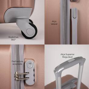 Fabricada em ABS, esta mala é resistente e durável, equipada com 4 rodas 360 que proporcionam fácil manobrabilidade. Possui cadeado fixo com senha para segurança, carrinho com ajuste de altura para maior conforto e alças de mão e lateral (nas versões M/G). No interior, conta com cinta elástica e divisória em zíper para manter tudo organizado. Além disso, o tamanho P é aprovado pela Agência Nacional de Aviação Civil (ANAC) para embarque, tornando-a a escolha perfeita para suas viagens.