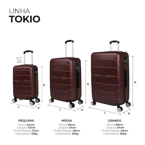 O Kit de malas de viagem ABS Tokio rodas duplas da Swiss Move é composto por três malas nos tamanhos P, M e G. A mala pequena serve como bagagem de mão, pois suporta até 10kg, é ideal para ir a bordo. Essas malas são práticas, leves, fáceis de transportar e perfeitas para qualquer destino.