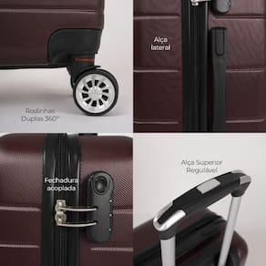 Fabricada em ABS, essas malas são resistentes e duráveis, equipada com 4 rodas duplas 360 que proporcionam fácil manobrabilidade. Possui cadeado fixo com senha para segurança, carrinho com ajuste de altura para maior conforto e alças de mão e lateral (nas versões M/G). No interior, conta com cinta elástica e divisória em zíper para manter tudo organizado. Além disso, a mala pequena é aprovada pela Agência Nacional de Aviação Civil (ANAC) para ir a bordo, tornando-a a escolha perfeita para suas viagens.